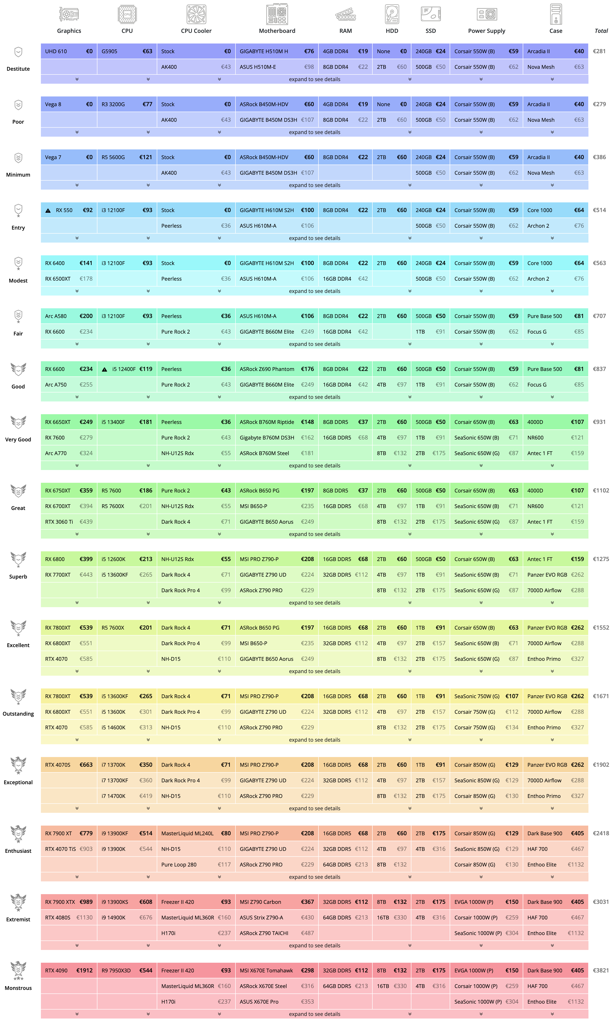 While looking for the best gaming resources, I found Logical Increments, a site that guides you through the selection of the best computer parts. Their homepage shows a table with columns for component types (motherboard, CPU, RAM, etc.) and rows for tiers of components that are guaranteed to work well together. Tiers are sorted by quality (from destitute to monstrous) and price (from under $300 to almost $4000).